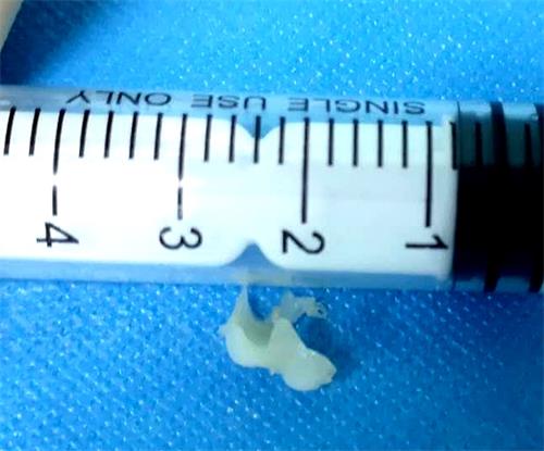 当天,患儿家长迅速带孩子来桓台县妇幼保健院儿科就诊,在问明病情的情况下,医生迅速联合麻醉科、放射科为患儿实施“气管镜下异物取出术”,不到20分钟,医生顺利将一块约1×1cm大小的鸡软骨从患儿气管中取出。
